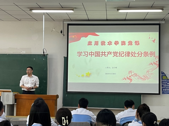为深入学习贯彻习近平总书记关于党纪学习教育重要讲话和指示精神,落实全面从严治党责任,扎实推进学院党纪学习教育工作部署,5月30日下午,williamhill中国党委书记金日明面向全体党员讲授《中国共产党纪律处分条例》的党课在教学楼A201展开。