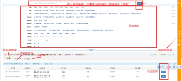第二步:要选修的课程,如果不知道什么时间段有空余时间,可以点击课表查询。