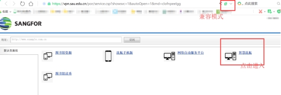 1.学生登陆https://vpn.sau.edu.cn/网站,点击智慧沈航。注意:推荐使用电脑用IE浏览器登陆,如果使用360,请切换到兼容模式,如下图所示: