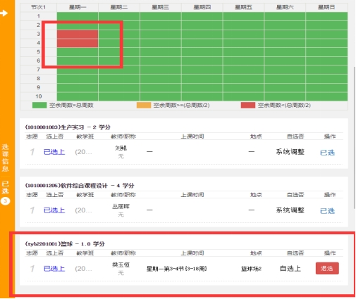 第三步:已选课程可以在课表当中实时查询到,也可以当时退选。